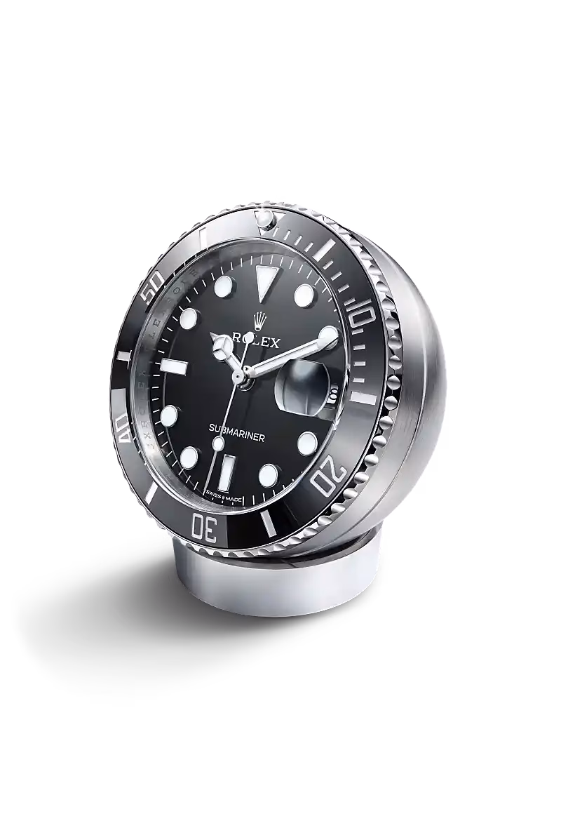 This Rolex desk clock with a secular calendar faithfully revisits the design of the Submariner Date. It displays the time and date with a 60-minute graduated monobloc Cerachrom bezel insert as well as a Chromalight display that emits an intense blue glow in the dark.